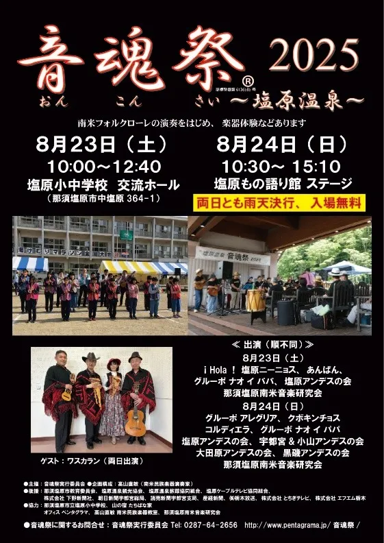 「音魂祭」は、南米民族楽器の演奏家である高山直敏氏が、那須塩原市で南米フォルクローレの素晴らしさを広めるために2011年に始めたイベントです。2014年より、塩原温泉で本格的な音楽フェスティバルとしての開催が始まり、地元住民や観光利用者にとって大切な文化イベントとなっています。