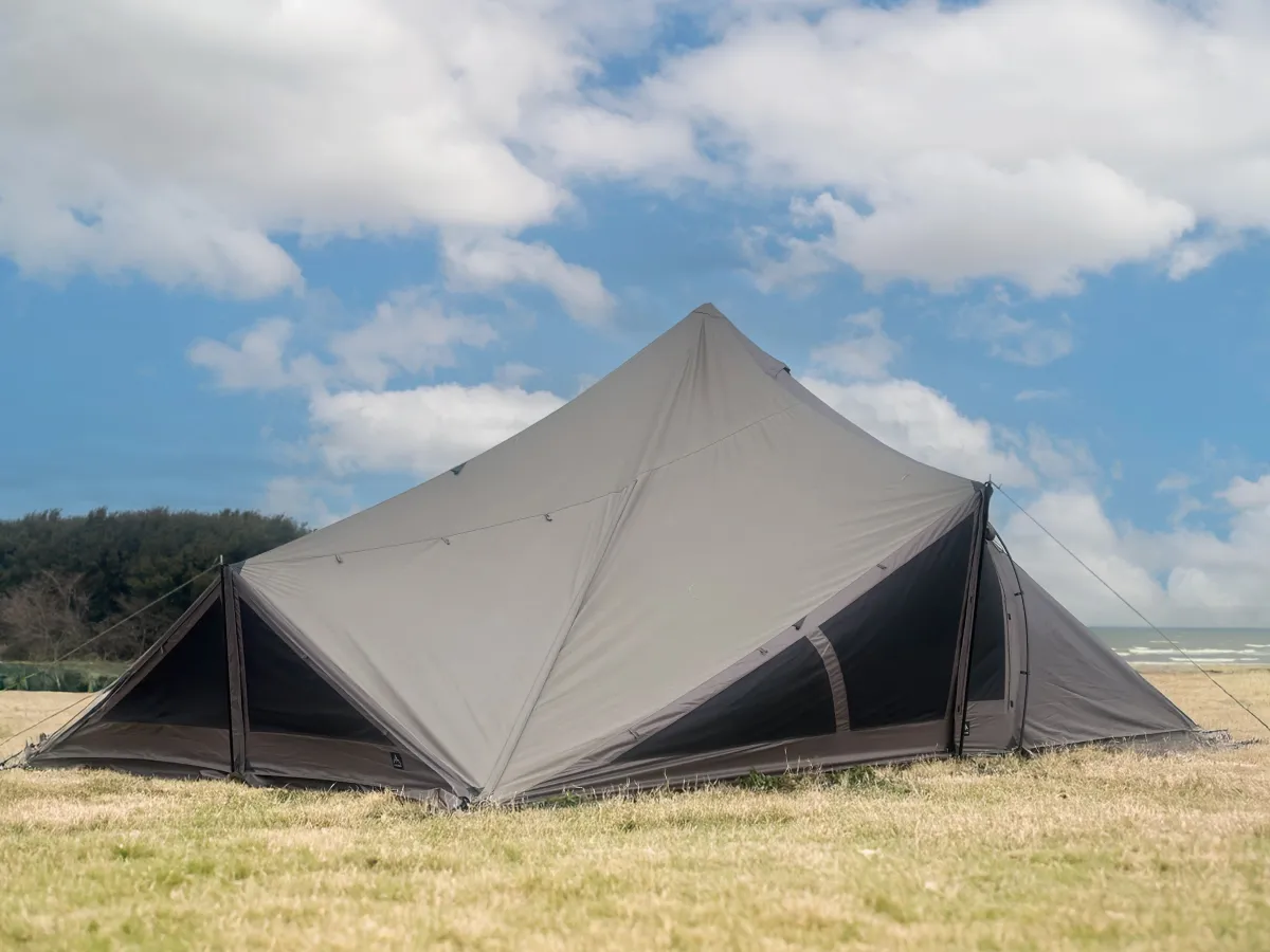 最初にご紹介するのは「TRIAS」。このモデルは、フルクローズ時にモノポールとアーチポールの構造を融合したテントで、5~6人用の大人数でも快適に過ごせる設計になっています。その価格は108,000円(税込)で、広々とした開放感を持ち合わせ、特にファミリーやグループキャンプにぴったりです。ポリコットンとポリエステルのハイブリッド素材により、焚き火の暖かさを感じつつも室内の快適さを確保しています。