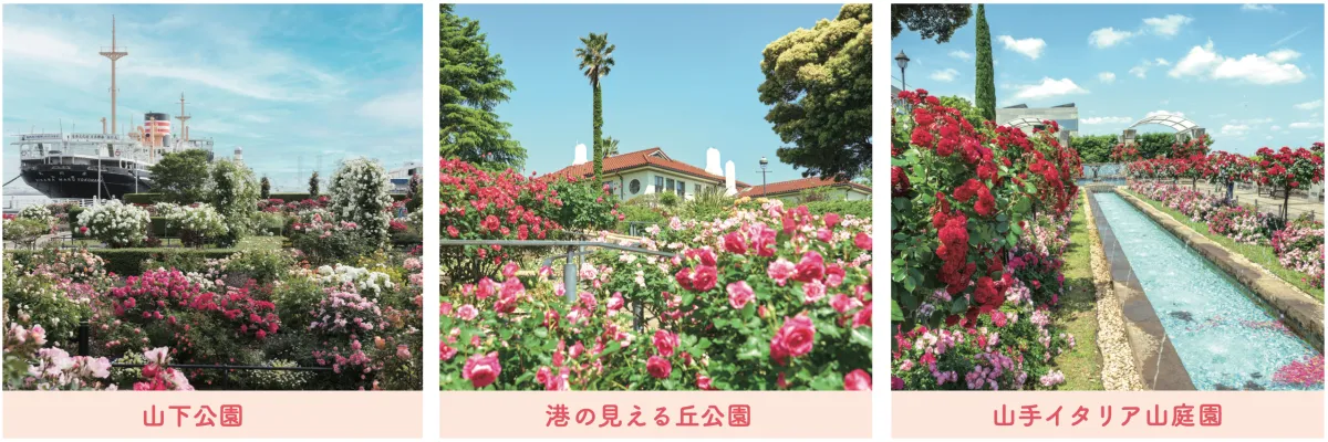 - - 開催場所: 山下公園、港の見える丘公園、山手イタリア山庭園、アメリカ山公園、横浜イングリッシュガーデン、八景島丘の広場バラ園 ほか