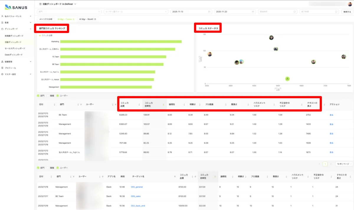 「SANUS AI」は、さまざまなコミュニケーションツール(Gmail、Slack、Outlook、Teamsなど)のメッセージをAIが解析し、10段階で評価することで、コミュニケーションの論理性や効率性を数値化。この機能により、不正会計やハラスメントのリスクも定量的に把握できるようになります。