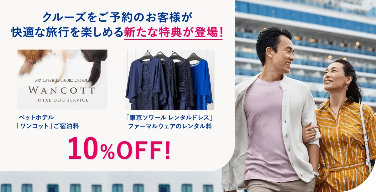 優待プランは、日本発着および海外発着のクルーズを新規または既存で予約したお客様が対象です。専用のクーポンコードを使用して、東京ソワールのレンタルドレスページにてお申し込みいただけます。詳細は特別優待ページをご確認ください。ただし、他のクーポンとの併用はできないため、最適な割引が適用されるよう注意が必要です。