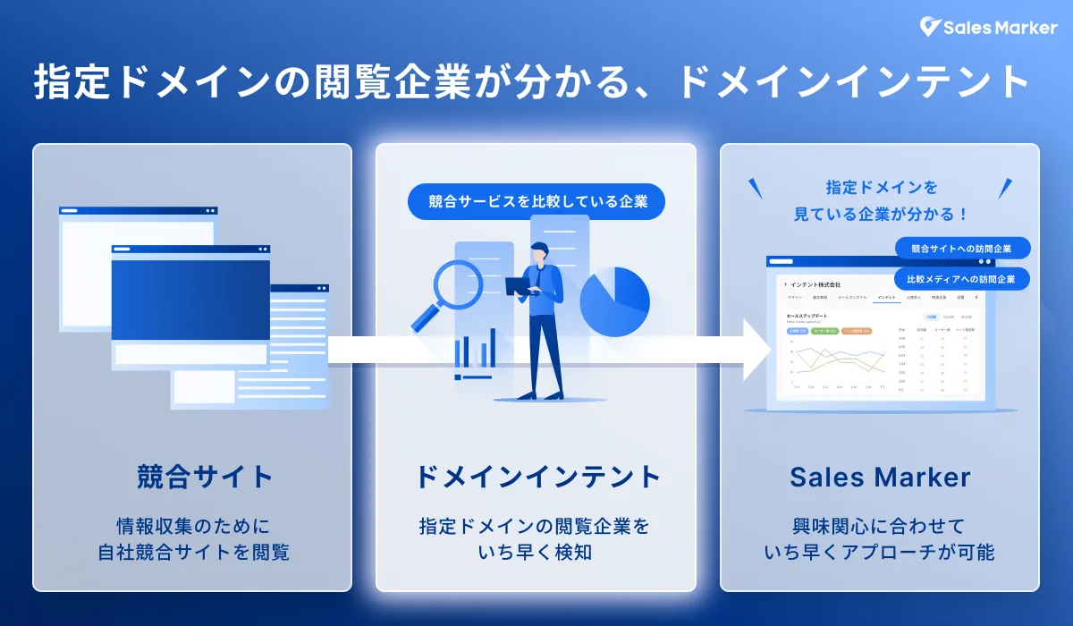 株式会社Sales Markerが展開する営業・マーケティング支援SaaS『Sales Marker』に新しい機能「ドメインインテント」が追加されました。この機能は、企業が指定した競合サイトや比較サイトといった外部ドメインのシグナルを活用することで、顧客の比較検討過程をより詳細に理解できるように設計されています。