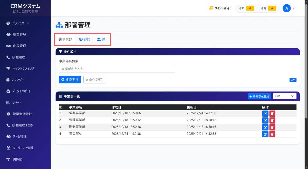 以前は「部署」単位で管理していたユーザー情報を、今後は「事業部 - 部門 - 課」という階層構造での管理が可能になります。この進化により、実際の組織構造に即したユーザー管理が実現します。また、大規模・多階層の組織でも柔軟な権限設定や集計が可能となり、営業状況の把握や分析が容易になります。