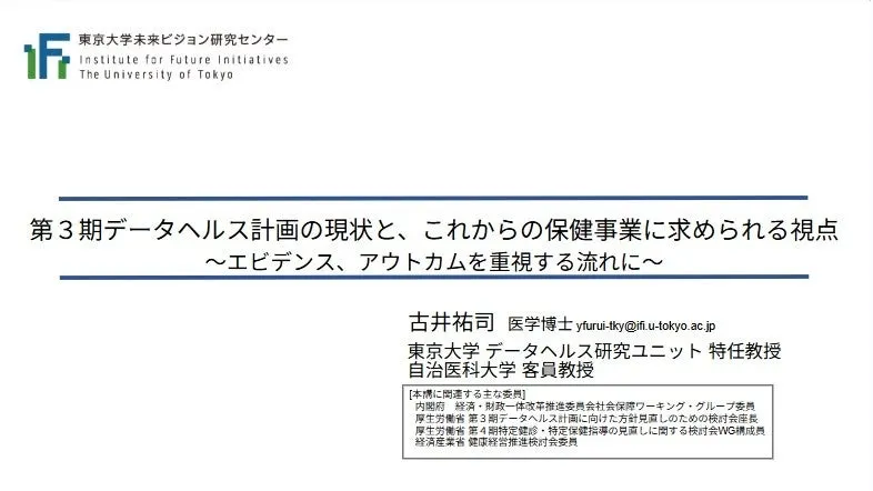 保険者たちが直面する共通の課題として、「ただ施策を行うだけでなく、具体的な成果、即ち数値の改善に結び付けること」が挙げられます。このセミナーでは、東京大学の古井祐司教授が基調講演を行い、データヘルス事業が目指す方向性について意見を交わしました。