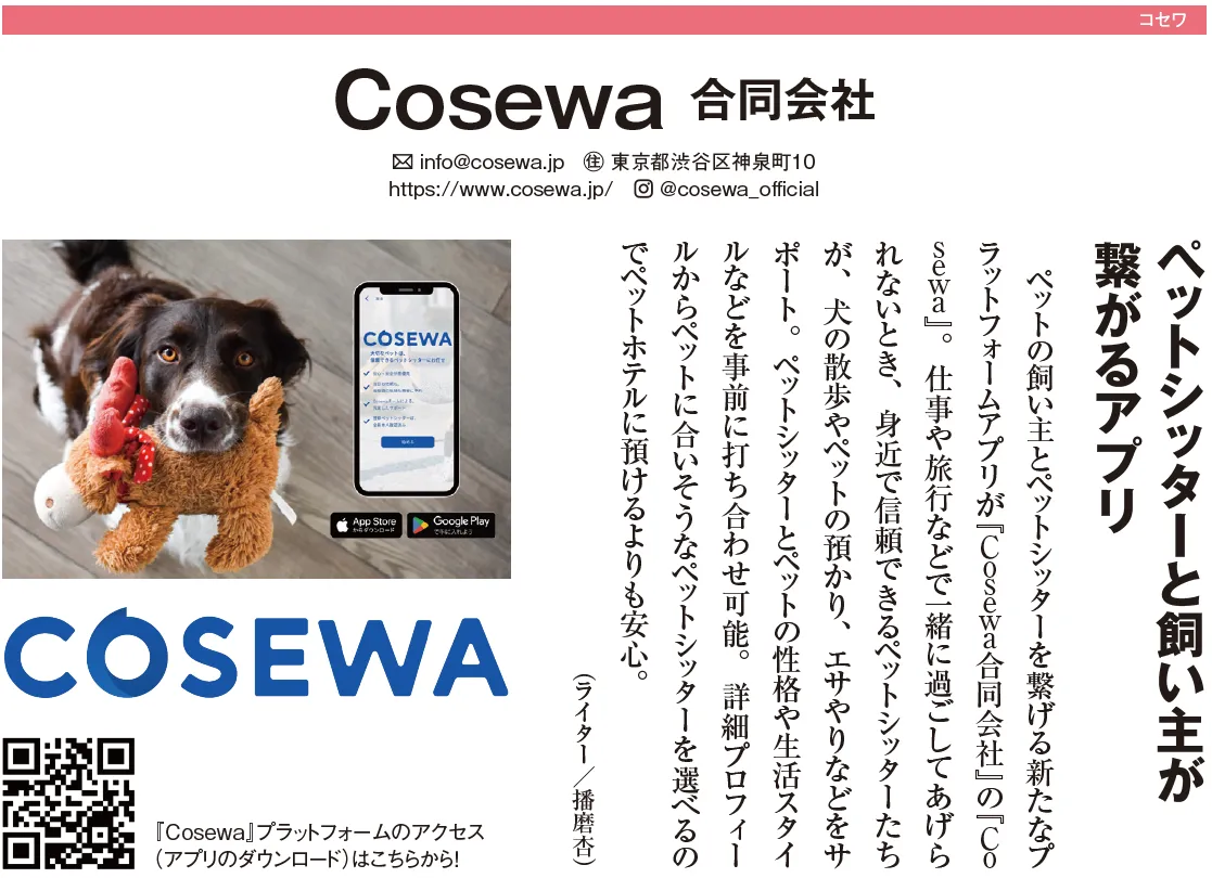 Cosewaが取り上げられたことにより、ペットシッターサービスの重要性がより多くの人に伝われば嬉しい限りです。これからも多くの飼い主の生活を支えるプラットフォームとして、Cosewaには期待しています。