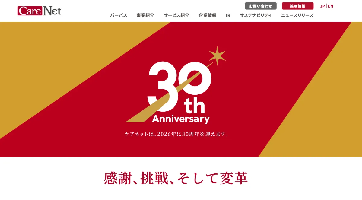 株式会社ケアネット(東京都千代田区)は、2026年7月1日をもって創業30周年を迎えます。この重要な節目を迎えられたのは、株主や利用者、お取引先、そしてケアネットを支えてきた全ての皆さまのサポートによるものです。この場を借りて、心からの感謝を申し上げます。