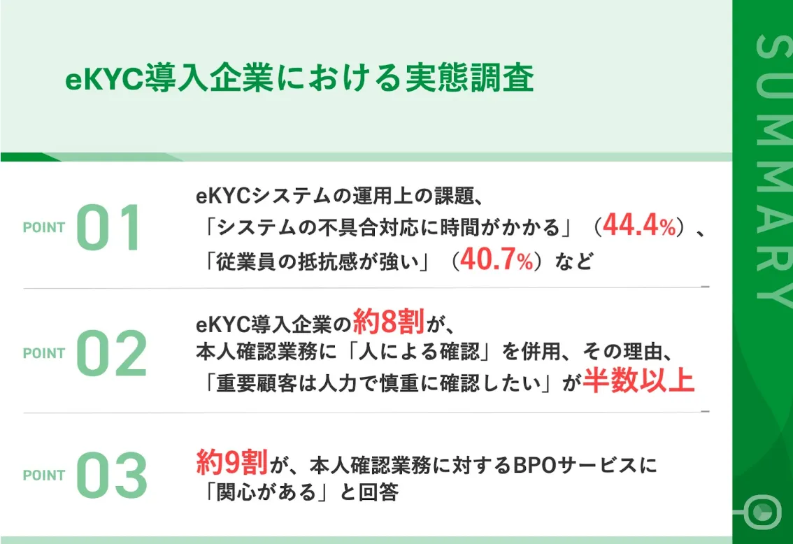 調査結果によれば、eKYCシステム運用の際に最も多くの実務担当者が直面している課題は「システムの不具合対応に時間がかかる」というもので、44.4%がこの問題を挙げています。その他にも、「従業員の抵抗感が強い」と「顧客からの問い合わせが多い」との声が3割以上寄せられ、スムーズなシステム導入には適切なオペレーションが求められることが示されました。