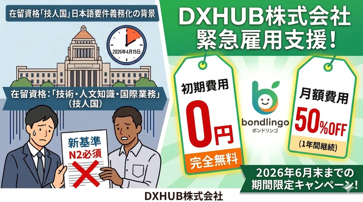 この新たな要件に合わせて、DXHUB株式会社は特別なキャンペーンを実施し、企業が外国人材をスムーズに採用・育成できるよう支援します。具体的には、オンライン日本語学習サービス「bondlingo」を初期費用0円、月額50%OFFという特別価格で提供することとしました。このキャンペーンは2026年6月30日までお申し込み可能です。
