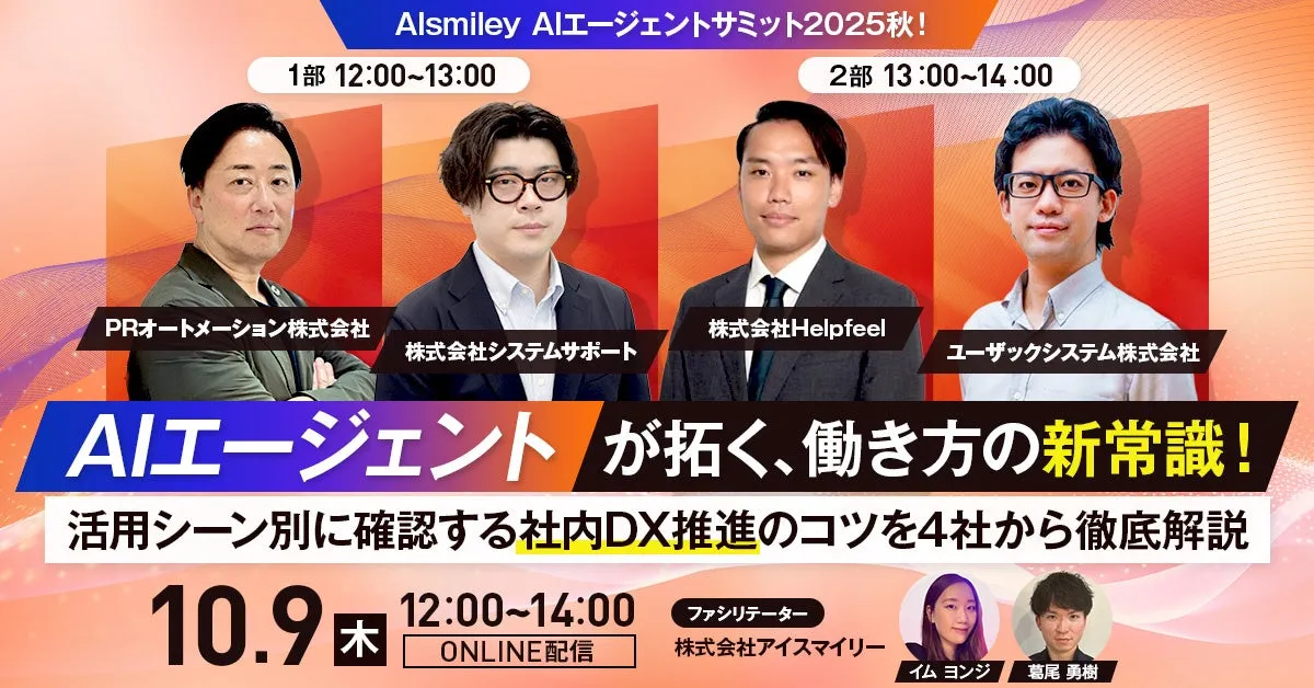2025年10月9日、AIsmileyによる「AIエージェントサミット2025秋」が開催されます。このウェビナーでは、AIエージェントの導入や活用方法、そして企業のデジタルトランスフォーメーション(DX)の進め方に焦点を当て、4社の専門家がそれぞれの視点から解説します。これからの働き方において、AIは不可欠な要素となっています。このイベントでは、その最新情報を無料で得ることができる貴重な機会です。