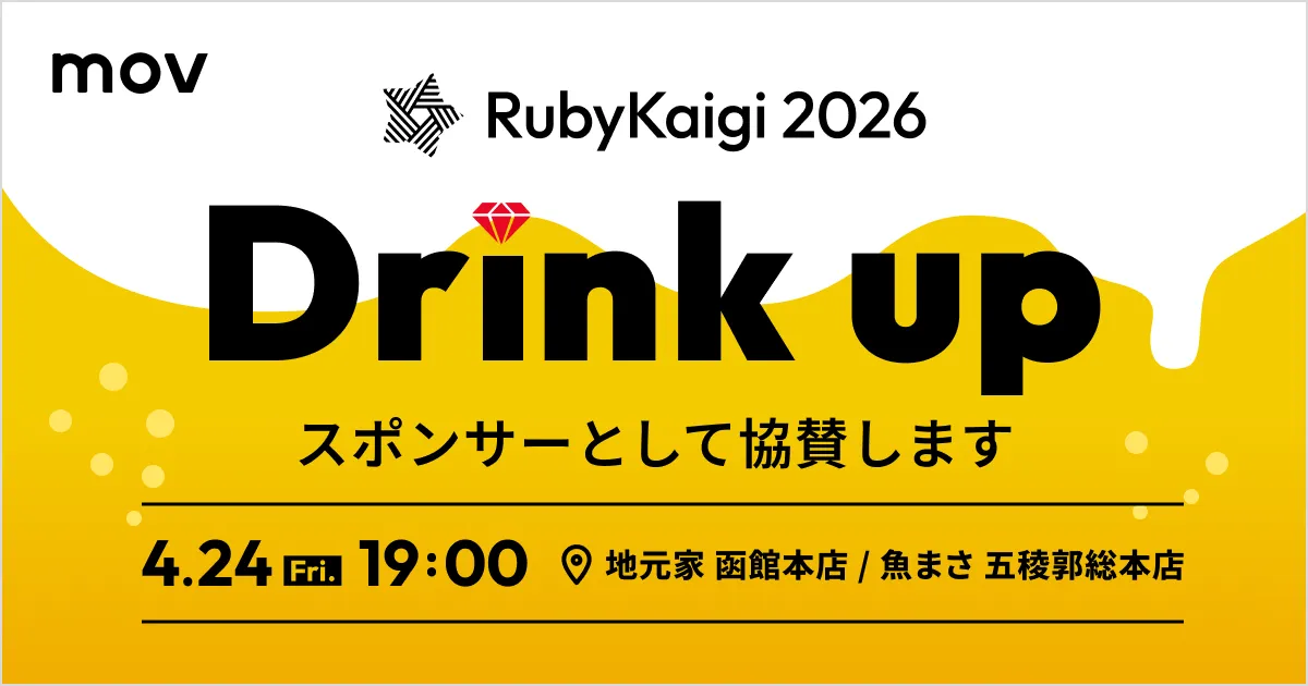 株式会社mov(代表取締役:渡邊 誠)は、2026年4月22日(水)から24日(金)まで北海道函館市で開催される「RubyKaigi 2026」にDrinkupスポンサーとして出展することを発表しました。このイベントは、プログラミング言語Rubyに特化した国際カンファレンスであり、毎年世界中から多くのRuby開発者が集まる重要な機会です。