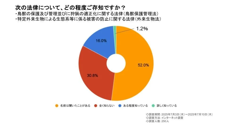 「鳥獣保護管理法」や「外来生物法」について尋ねたところ、52.0%が「名前は聞いたことがある」と答えたものの、実際に詳細を理解している人はわずか16.0%にとどまりました。さらに、約30.8%の人が「全く知らない」と答え、法律の周知不足が浮き彫りとなりました。