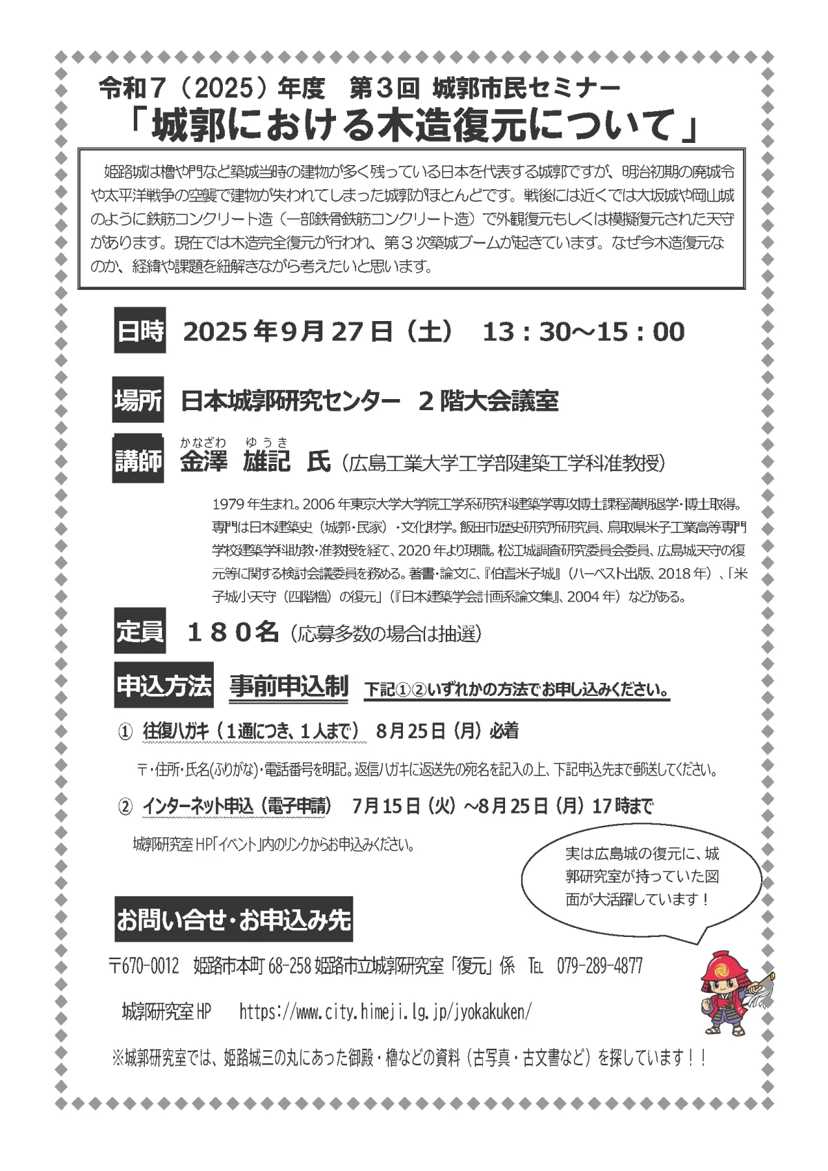 このセミナーを通じて、古の城郭の魅力を理解し、木造復元についての意識を高める機会となることを願っています。歴史を未来につなげる一助として、ご参加を心よりお待ちしております。