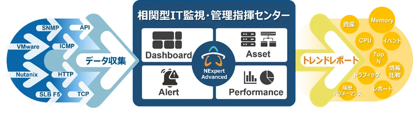 「NExpert Advanced」は、これらの次世代のニーズに応えることを目的としており、相関関係を視覚化するダッシュボード技術やマルチベンダー対応の統合設計を導入しています。これにより、企業はより明確なIT管理体制を整えることができます。