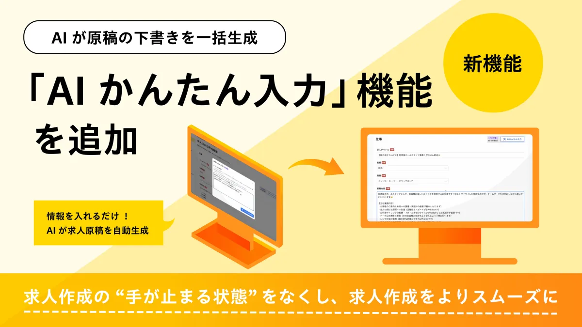 新しく追加された「AIかんたん入力」機能は、シンプルな入力を行うだけで、必要な情報を自動的に生成することを可能にします。求人のタイトル、業務内容、注意事項、持ち物、働くための条件、働く前の質問等を、一括して作成することができ、細かな指示を必要としないため、手間が省けるのが特徴です。事業者はポイントとなる最小限の情報を入力するだけで、AIが適切な求人文を提案してくれます。これにより、求人原稿の作成にかかる時間を大幅に短縮することができます。