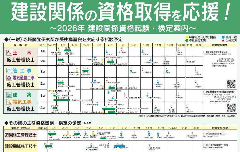 一般財団法人地域開発研究所が、未来の地方創生を担う建設技術者を育成するために、施工管理技士資格取得を目指す方々へのサポートを強化しています。2026年の建設関係資格試験や検定に関する情報をまとめたポスターが無料で配布されるので、受験者はぜひ活用していただきたいです。