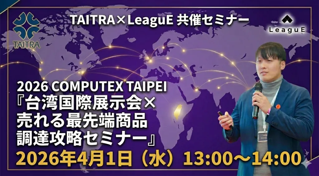 2026年4月1日(水)に、株式会社LeaguEと台湾貿易センターが共催で開催する「台湾国際展示会×売れる最先端商品調達攻略セミナー」が注目を集めています。このセミナーでは、海外展示会を単なる視察に終わらせず、ビジネスチャンスに結びつけるための実践的な知識が得られます。