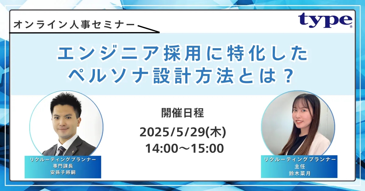 転職サイト「type」は、2025年5月29日(木)に「エンジニア採用に特化したペルソナ設計方法とは?」というセミナーを開催します。このイベントでは、特にエンジニアの採用を行っている企業向けに、効果的なペルソナ設計の方法を学ぶことができます。