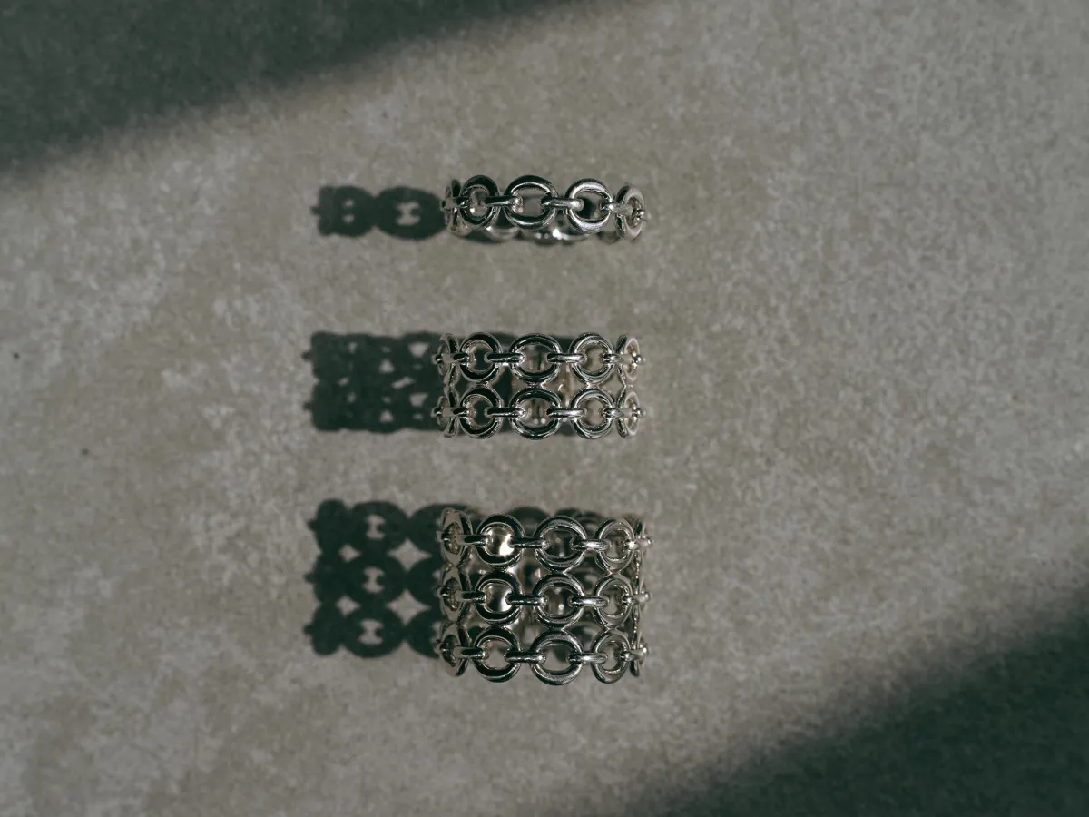 MAILSシリーズでは、1連、2連、3連の3種類のリングが展開されています。特に人気なのは、存在感のあるボリュームと心地よい着け心地を兼ね備えた3連リングです。価格は、シルバー925を使用したものが約¥24,200と手頃で、ファッションに合わせて選ぶ楽しさもあります。