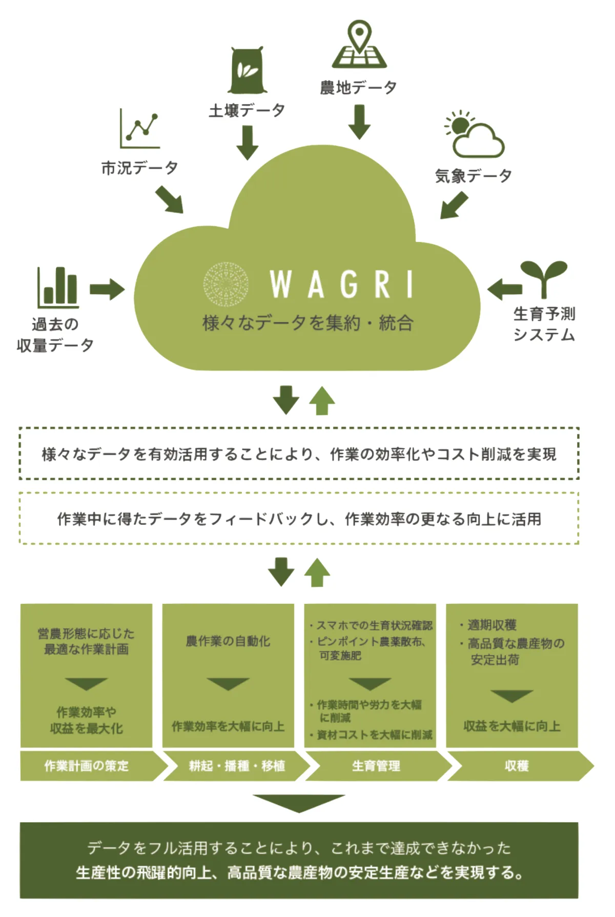 WAGRI(農業ICTクラウドサービス)は、気象データや農地情報、収量予測など、農業に役立つデータを提供する公的なプラットフォームです。登録したICTベンダーや農機メーカーは、これらの情報を活用し、生産性向上や新たなWebサービスの開発を行います。WAGRIを通じて多様なデータを統合し、農業向けのアプリケーション作成が可能になります。