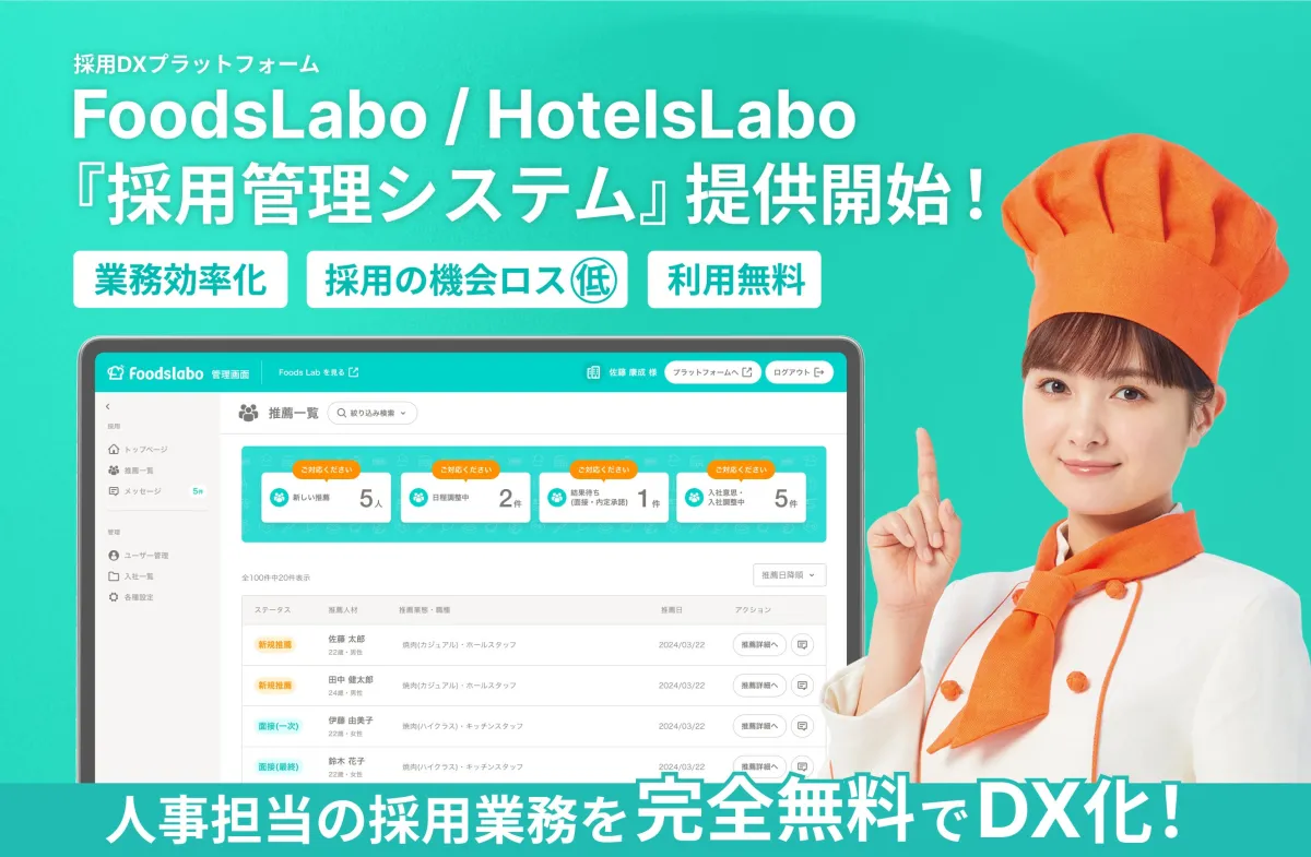 株式会社クオレガが展開する「採用DXプラットフォームFoodsLabo・HotelsLabo」に、新しいサービスとして『採用管理システム』が追加されました。2025年1月21日から利用可能となり、このシステムを通じて飲食・宿泊業界の企業様がより効率的な採用活動を行えるようになります。