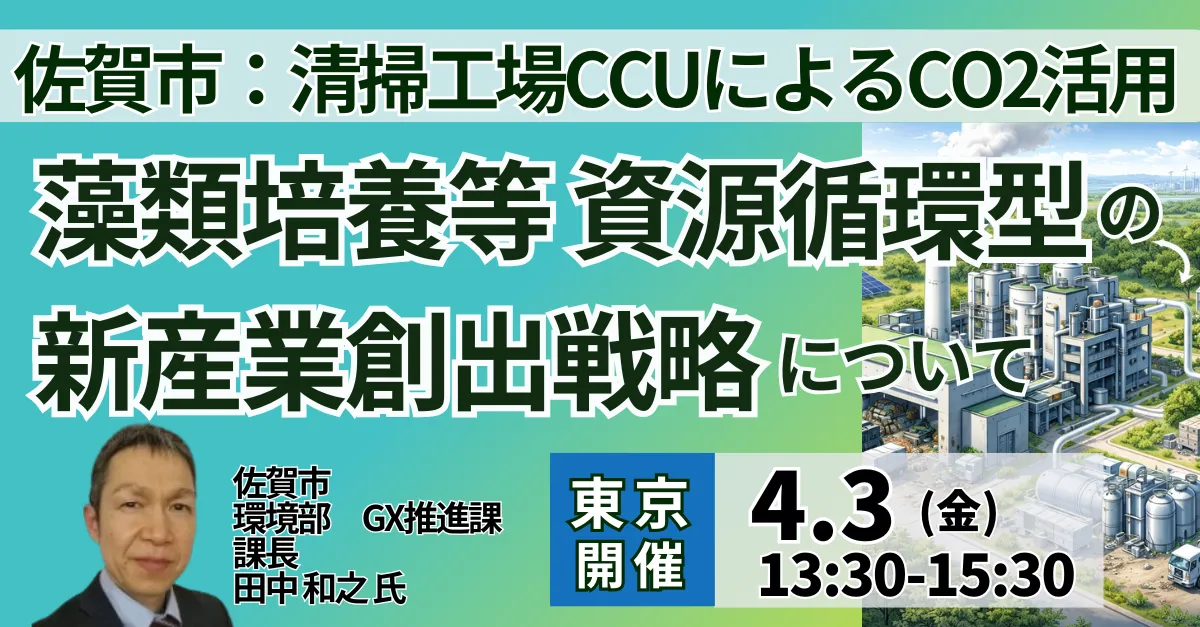 2026年4月3日、佐賀市と日本計画研究所が共催するセミナーが東京で開催されます。テーマは、「清掃工場CCUによるCO2活用、藻類培養等 資源循環型の新産業創出戦略」についてです。このセミナーでは、佐賀市環境部GX推進課の田中和之課長が登壇し、清掃工場でのCO2利用について詳しく説明します。
