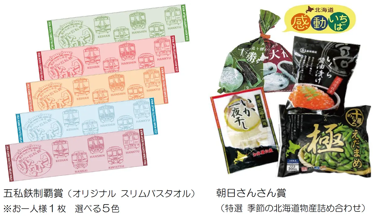 開催初回の京阪回に参加した方には、特別な参加賞としてオリジナルワッペンが贈られます。また、全5回のイベントにすべて参加された方には、「五私鉄制覇賞」という特別な賞が授与される他、各回ごとに参加者の中から抽選で「朝日さんさん賞」もプレゼントされます。