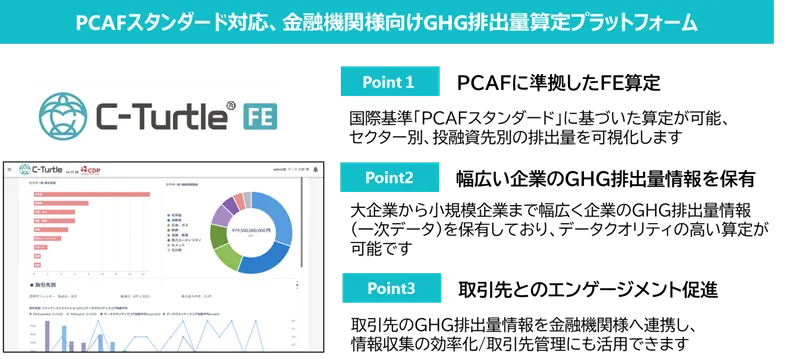 NTTデータは、金融機関との長年の連携により積み上げたノウハウを活かし、C-Turtle FEを提供することにより、金融機関のGHG排出量可視化を効率化します。この取り組みを通じて、金融機関とその投融資先が一体となってGHGの排出量を削減する支援を行います。