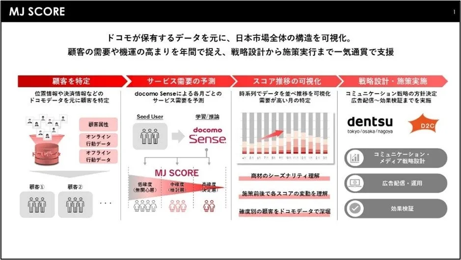 D2Cは顧客分析のノウハウ、ドコモはデータ提供、電通はプロモーション戦略の企画と実行を行います。この三社の協力関係が、「MJ SCORE ™」の強みであり、マーケティング課題を解決し、企業の価値を最大化することが期待されています。