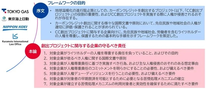このフレームワークは、国連の「ビジネスと人権に関する指導原則」を基に作成され、プロジェクト関係者による人権配慮の強化を目指すものです。各社は社内向けの実務基準も策定し、フレームワークの実効性を高める取り組みを行っています。この取り組みにより、東京ガスはカーボンクレジットの品質を担保し、信頼性を向上させることを目指しています。