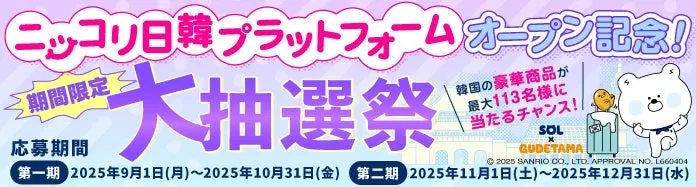 プラットフォームオープンを記念して、現在「ニッコリ日韓プラットフォームオープン記念大抽選祭」を開催しています。第二期は2025年11月1日から始まります。今回の大抽選祭では、なんと最大113名のお客様に豪華な賞品をプレゼントします。旅行や食事、家電製品など、さまざまな豪華景品用意されていますので、ぜひこの機会をお見逃しなく!