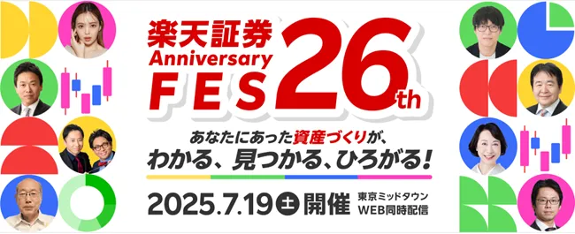 2025年7月19日の午前10時から、東京の東京ミッドタウンにて「楽天証券26th Anniversary FES」が開催されます。本イベントのテーマは『あなたにあった資産づくりが、わかる、見つかる、ひろがる!』です。