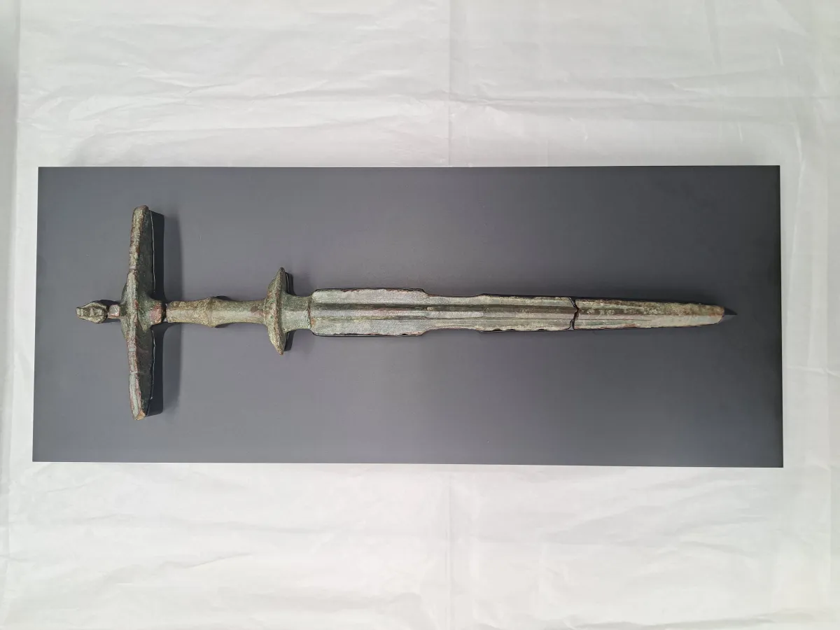 この有柄細形銅剣は、1901年に長門市の王屋敷遺跡で偶然発見されたもので、1956年には国の重要文化財に指定されました。銅剣の長さは約44.1cmで、その特徴は剣身と柄、さらに把頭飾が一体化して鋳造されている点です。この銅剣は、単なる武器ではなく、権威の象徴としての役割を果たしていたと考えられています。弥生時代中期頃に作られたと推測されており、日本全国で発見された弥生時代の銅剣の中でも、この銅剣は非常に少ない5本のみ。吉野ケ里遺跡からも同型の銅剣が出土しているため、古代の謎を解く上で重要な資料となっています。
