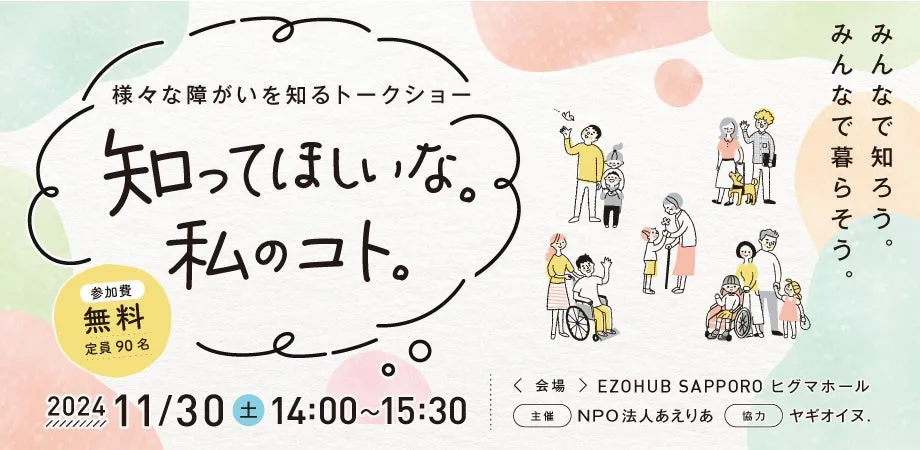 このイベントでは、障がいを持つ子どもたちやその家族をゲストとして招き、彼らの体験を共有する形式で行われます。日付は2024年11月30日(土)の14:00〜15:30(開場は13:30)で、場所は札幌市東区にあるEZOHUB SAPPOROです。参加費は無料で、定員は90名。事前に予約が必要となっています。特に、バギーや車椅子をお使いの方の人数も確認したいので、事前の申し込みをお願い致します。