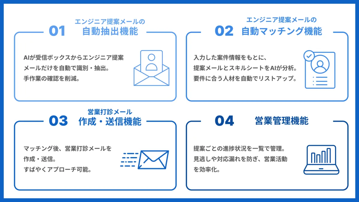 マッチングが成立したエンジニア提案に対して、営業打診メールを自動生成し、直接送信が可能になります。これにより、即座にアプローチできる体制が整い、機会損失を確実に減少させることができます。