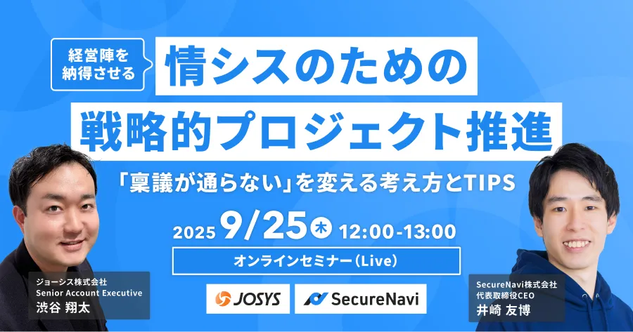 SecureNavi株式会社は、ジョーシス株式会社と共同で、無料オンラインセミナー「経営陣を納得させる 情シスのための戦略的プロジェクト推進」を2025年9月25日に開催します。このセミナーは、情報システム担当者や情報セキュリティ担当者が直面する課題に焦点を当て、経営層を巻き込んだセキュリティの取り組み推進に必要な知識やスキルを学ぶ良い機会です。
