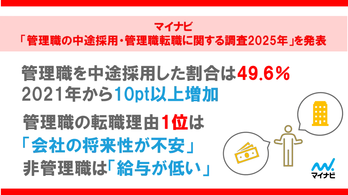近年、企業の経営環境は大きく変化しています。特に2025年において、管理職の中途採用は急増しており、株式会社マイナビがまとめた調査によると、2025年の上半期に管理職を中途採用した企業は49.6%に達したことが報告されています。この傾向は2021年からの増加を著しく示しており、企業が直面するさまざまな課題への対応策として、即戦力となる管理職の確保が重要視されています。