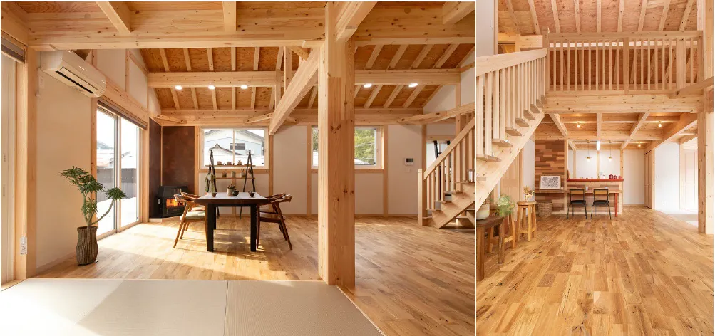 外観とは裏腹に、室内は広々とした空間が広がっています。大きな吹き抜けと、重厚感のある大黒柱が居住空間を支え、ナチュラルカラーで統一された内装は木の温もりを感じさせてくれます。特に、株式会社綿半林業SHが提案する畳コーナーや薪ストーブ、オリジナルダイニングカウンターは生活のクオリティを格段に向上させてくれます。