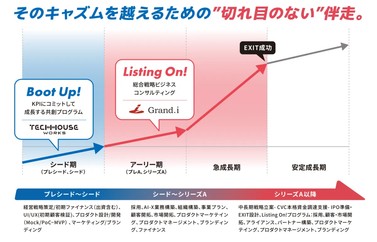 このイベントでは、シード期からEXIT(上場またはM&A)までをカバーするスタートアップ向けプログラム「Boot Up! & Listing On!」が披露されます。このプログラムは、TechHouse.Worksのシード期の支援「Boot Up!」と、Grand.iのシリーズA以降の支援「Listing On!」が融合したもので、各段階に応じた的確な経営支援、資金調達、EXIT戦略を提案します。