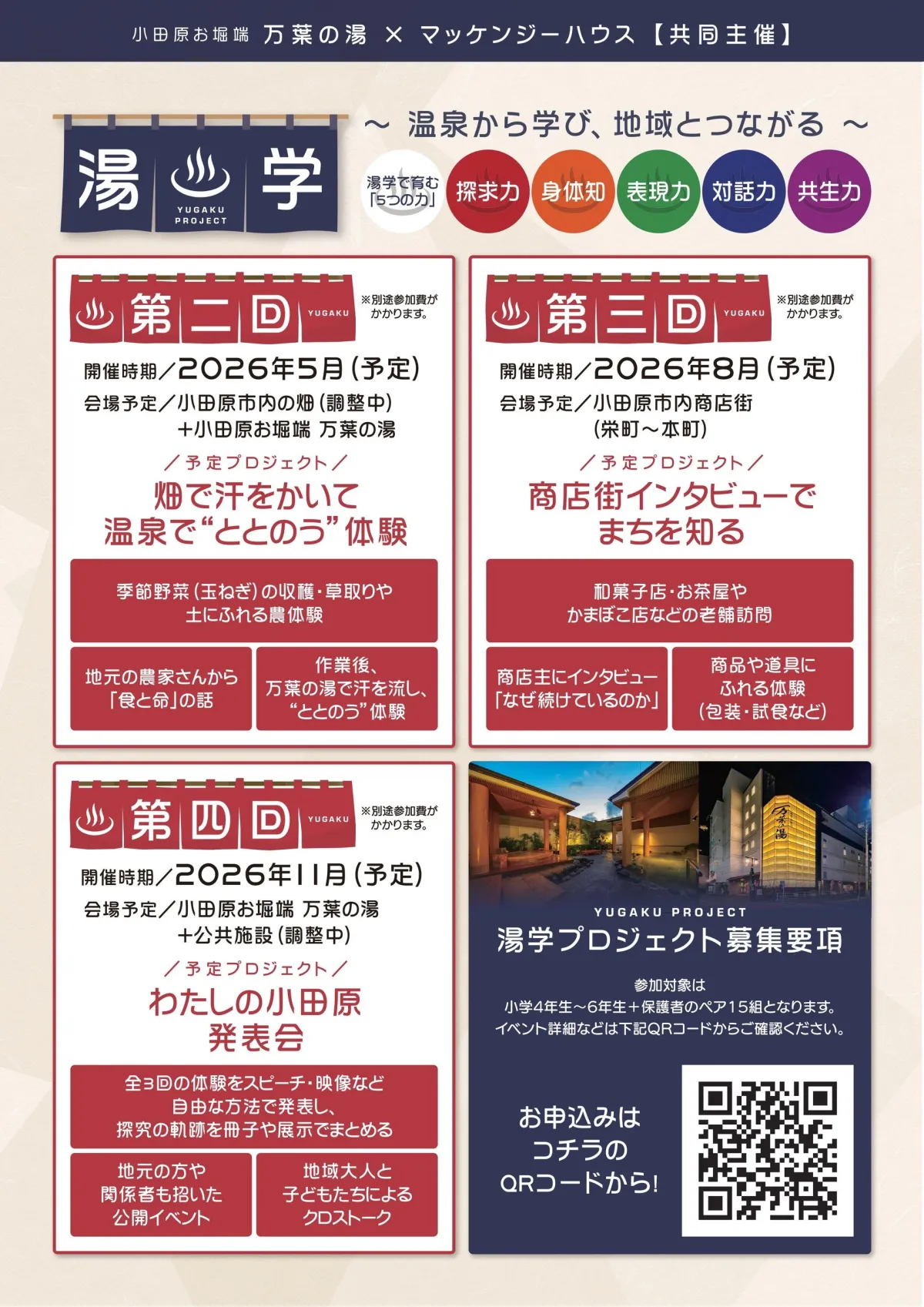 親子で地域の魅力を手に入れるための新たな取り組み、探究型教育プログラム「湯学(YUGAKU PROJECT)」が2026年2月、小田原お堀端 万葉の湯と株式会社マッケンジーハウスの共同主催で始まります。本プログラムでは、温泉を題材にして子どもたちが自ら問いを立て、体験を通じて学び、感じたことを言葉にする力を養うことを目指しています。
