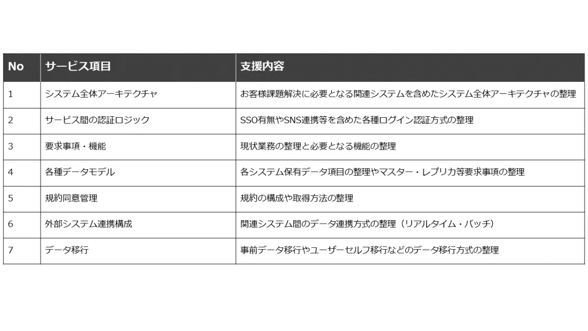 顧客ID管理・認証基盤の導入にあたり、単独のシステムだけでなく、関連する環境やバックエンドとの連携も考慮した全体アーキテクチャの策定をサポートします。ITの専門家が既存システムの情報をもとに最適なアーキテクチャを提案します。