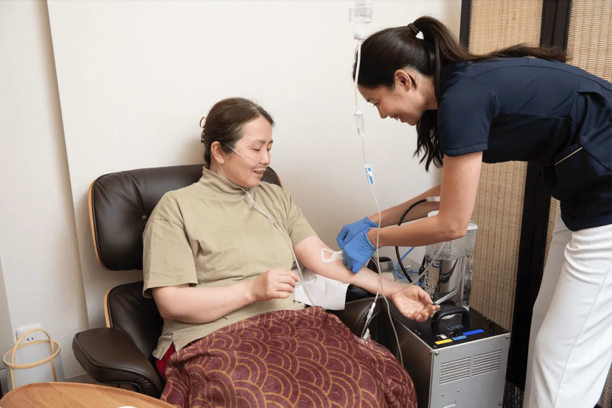 この新サービスでは、効率的に脳をリフレッシュするための2つの施術が行われます。1つ目は「ブレイン・チャージ点滴」。数種類の有効成分をブレンドしたオリジナルの点滴を用い、脳の働きをサポートします。