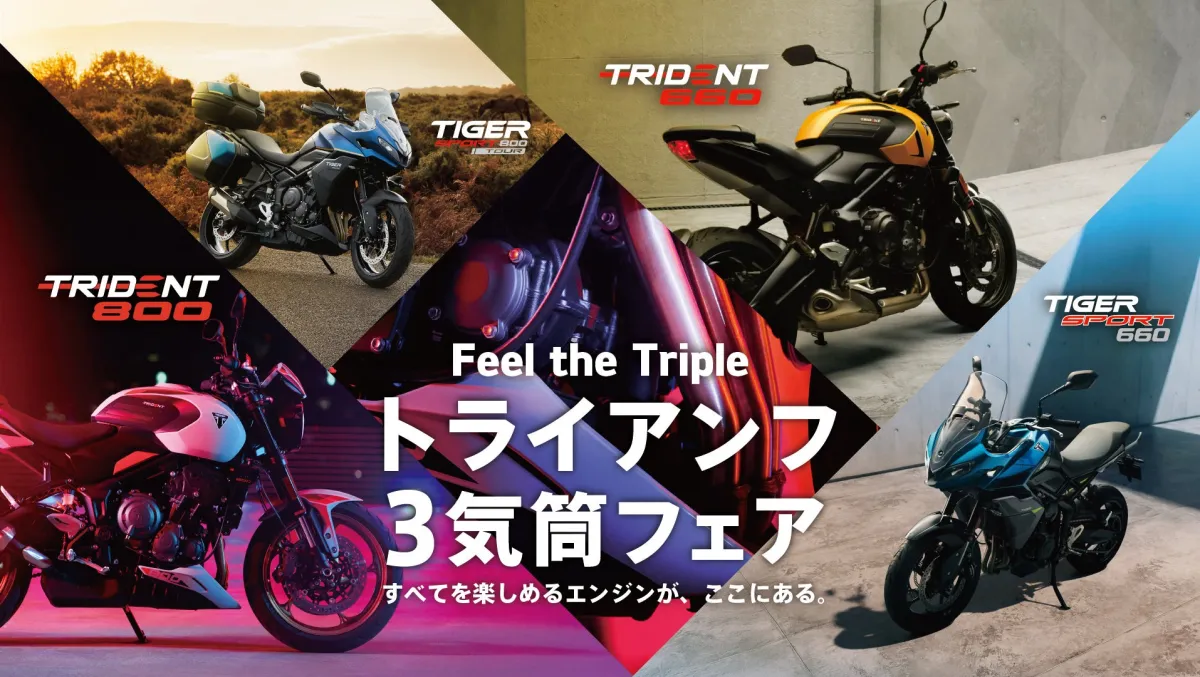 この「Feel the Triple トライアンフ 3気筒フェア」で、ぜひトライアンフの新しいモデルを体験し、その魅力を実感してください。ライダーの皆さまにとって忘れられない体験となることでしょう。予約や詳細については、トライアンフ公式ウェブサイト(