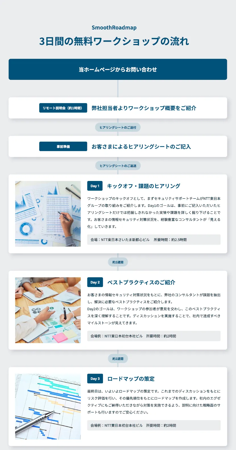 「SmoothRoadmap」では、3日間を通じて、各企業が抱えるセキュリティの問題点を可視化し、その順位を整理することから始まります。その後、NTT東日本の経験豊富なセキュリティコンサルタントが、企業ごとに合わせた改善のための詳細なロードマップを描くプロセスが行われます。このワークショップは、1社ごとに行われるため、個別のニーズに応じた対応が可能です。成果を上げている標準的なベストプラクティスをもとに、企業の特性やルールに合った対策案が提示されます。
