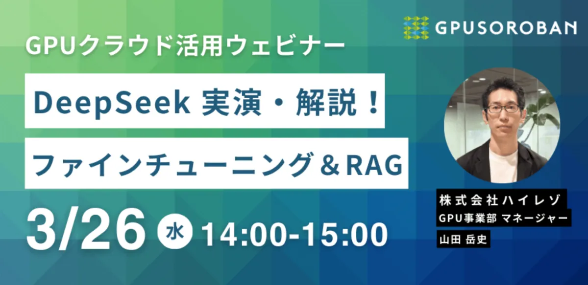 2025年3月26日(水)に、株式会社ハイレゾが主催するウェビナーが行われます。今回のテーマは、AI開発における重要な技術、DeepSeek-R1のファインチューニングとRAG(Retrieval-Augmented Generation)構築方法です。このウェビナーはオンラインで行われ、参加は無料、最大1000名が視聴可能です。