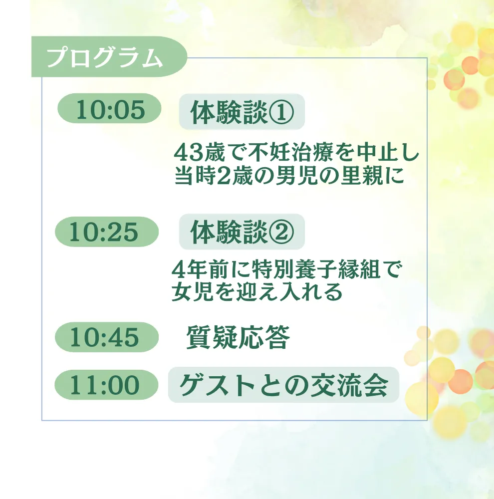 今回のオンライン交流会では、実際に不妊治療を経て里親や特別養子縁組の養親となったお二人を招き、彼らの体験談を聞くことができます。また、参加者同士が交流できる機会も設けられており、同じような経験を持つ方々と自由にお話しすることができます。