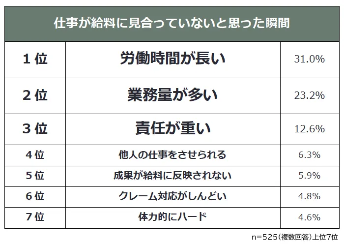 調査の続く2位は「業務量が多い」という結果です。多くの人々が自分の能力に対して過剰な業務負担を感じており、特に若い世代は特定のスキルや資格を持つがゆえに追加の責任を背負わされることが多いようです。これにより、見合わない給料に対する強い不満が発生しています。