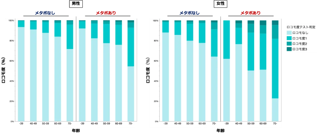 研究では、50代の被験者においてロコモとメタボが同時に存在することによって、腹囲や血糖値の上昇が見られ、高血圧、糖尿病、高脂血症の治療を受けている人の割合も高いことが示されました。これにより、メタボとロコモの合併が、今後の健康問題、生じる可能性が高いことが指摘されています。一般的に、ロコモは高齢者特有の問題と認識されていますが、今回の研究により中高年期でもそのリスクが顕著になることが明らかとなりました。論文によると、このリスクを中年期に早期に把握し介入するためには、メタボとロコモの同時健診が必要であるとされています。