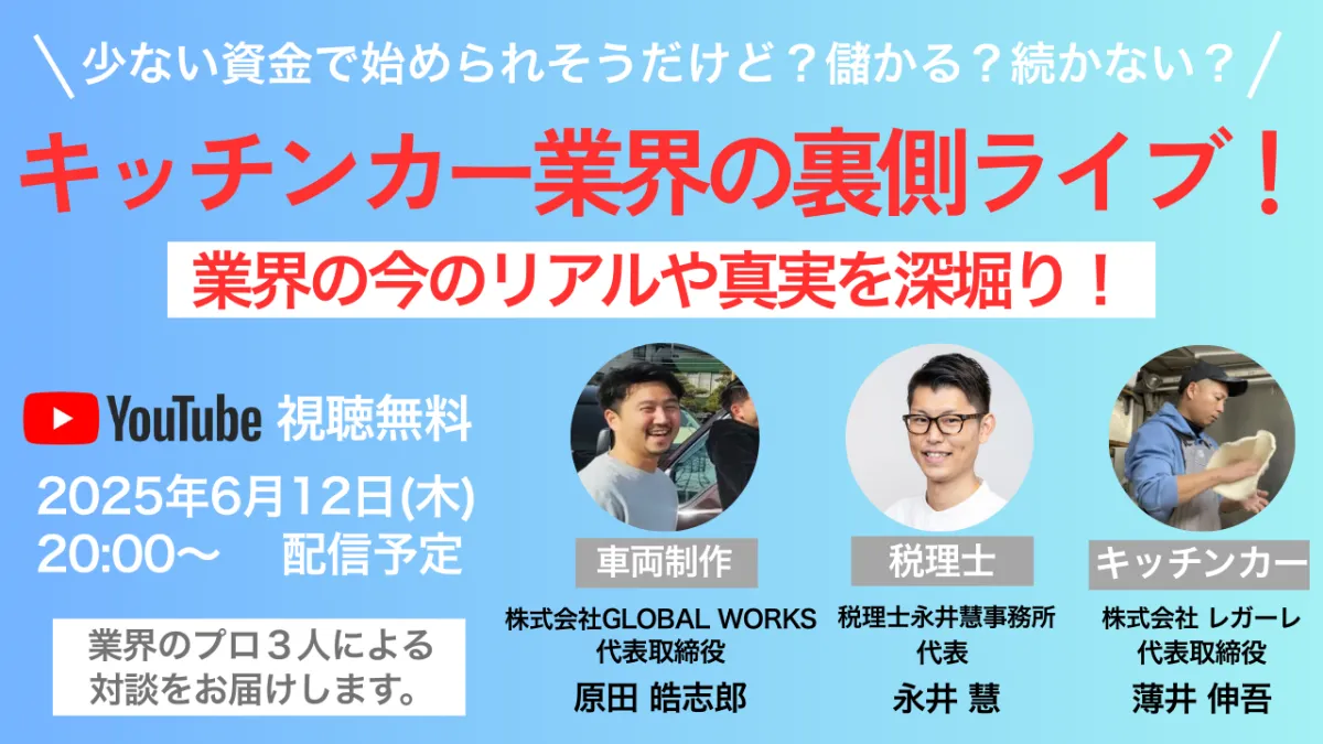 2025年6月12日(木)20:00から、YouTubeで特別なライブ配信が行われます。この配信では、キッチンカー業界の内幕について、3名の専門家が対談形式でさまざまな視点からお話しします。自らもキッチンカーを運営し、開業支援を手がける株式会社レガーレの薄井伸吾社長をはじめ、車両制作を行うGLOBAL WORKSの原田皓志郎氏と、若手税理士の永井慧氏が登場します。