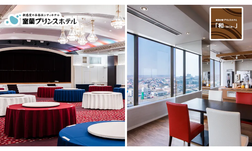 新苫小牧プリンスホテルでは、会場使用料が120分無料になり、デジタルサイネージやマイクの貸出も無料です。特に、当日宿泊をご希望の場合は優待価格でのご案内が受けられるのも嬉しいポイント。円卓での正餐形式や、苫小牧市内の美しい景色を楽しめる11階のレストラン「7stars」など、様々なスペースがご利用可能です。