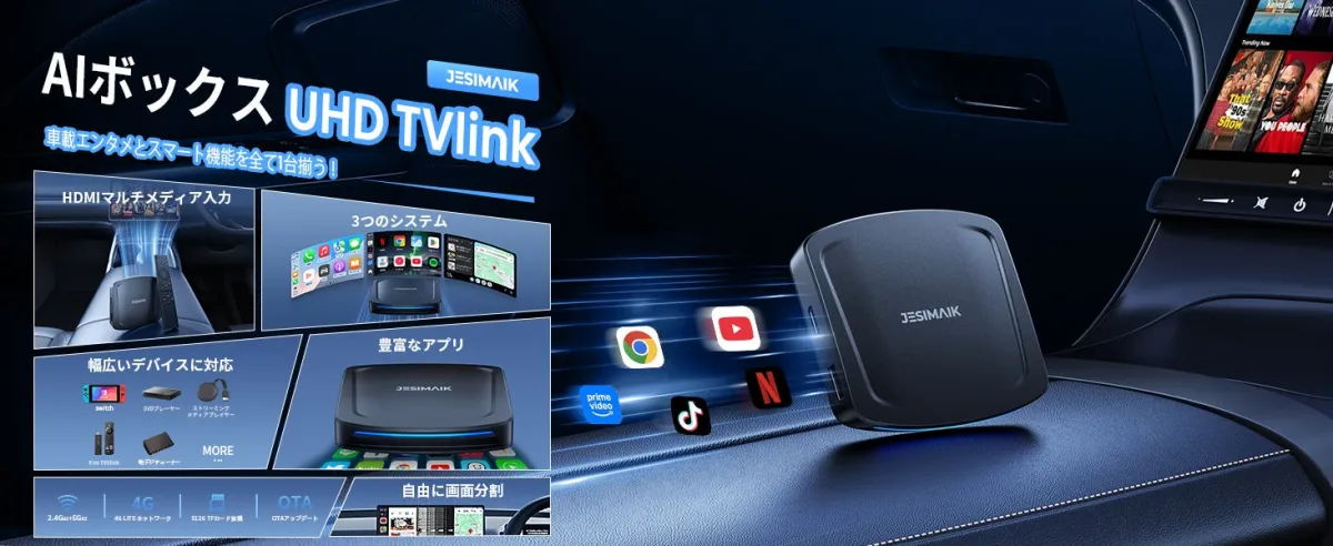 JESIMAIK(ジェスマイク)は2025年12月25日に、新しいAI BOX「UHD TVlink」の販売をオンラインストアで開始します。この製品は、次世代の車内エンタテインメント体験を提供するために設計されたデバイスです。従来のモデルと比べて、HDMI入力機能を新たに加えたことで、より多様なコンテンツを楽しむことができるようになっています。